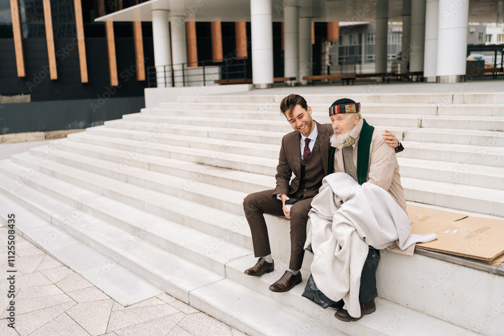 Wide shot of smiling compassionate entrepreneur engaging in conversation with homeless senior citizen. Kind businessman in suit listening with empathy to homeless elderly man talking sitting on bench.