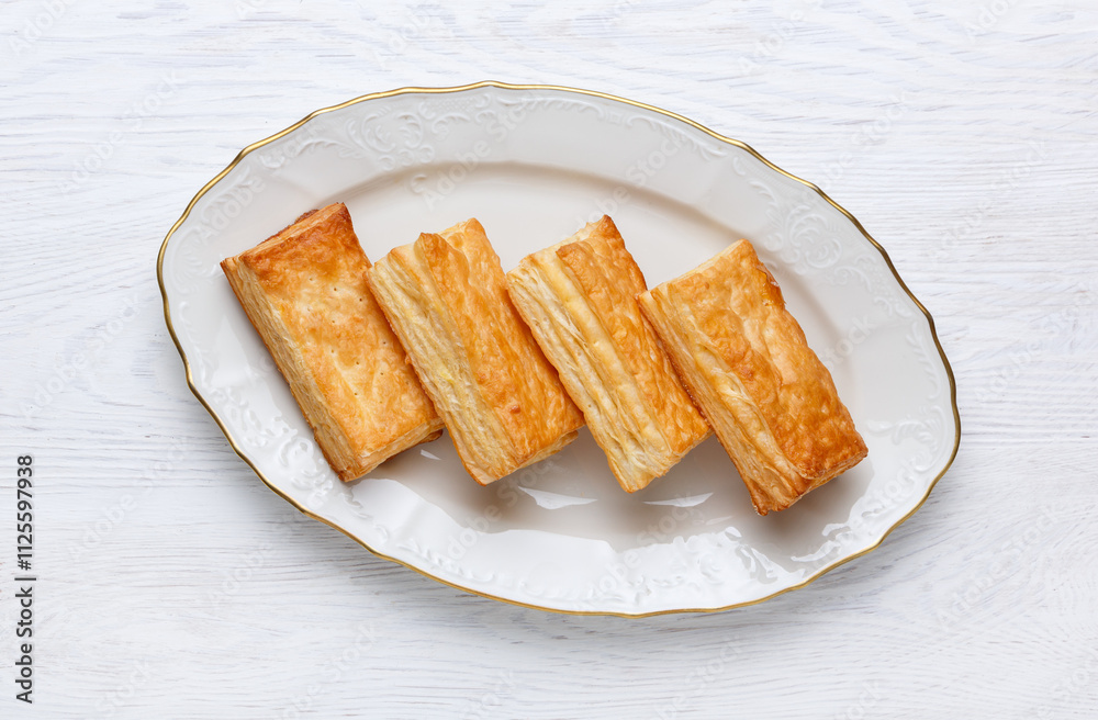 Delicious puff pastries in a white plate on a white wooden table. Puff pastry. Selective focus