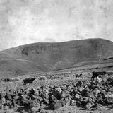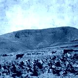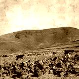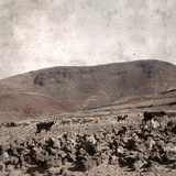 textured stylish old paper background, square, with landscape of Gran Canaria with goats and sheep