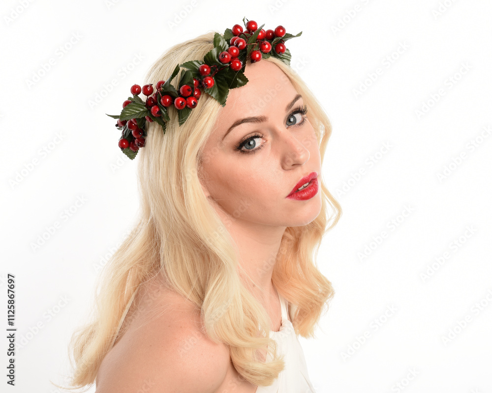 close up portrait of beautiful blonde female model wearing holly and ivy Christmas fantasy wreath crown headdress. isolated silhouette on white studio background.