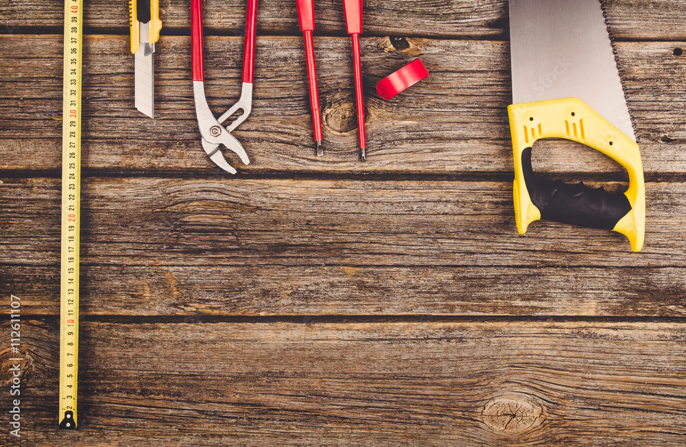 Construction equipment and tools on wooden table. Concept photograph taken from above, top view.