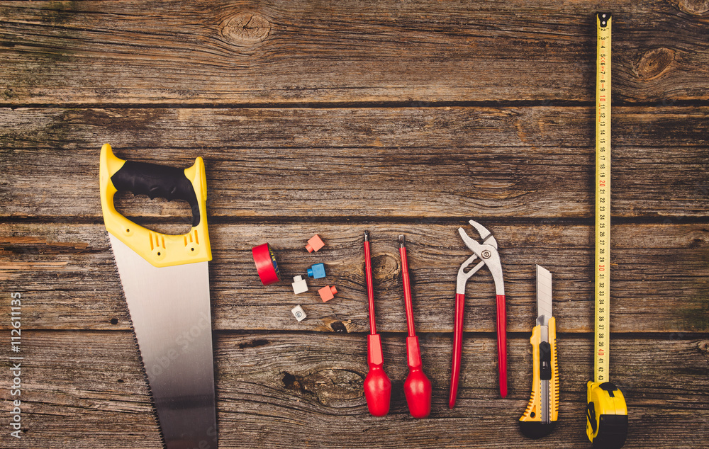 Construction equipment and tools on wooden table. Concept photograph taken from above, top view.