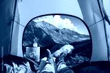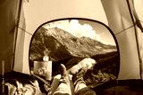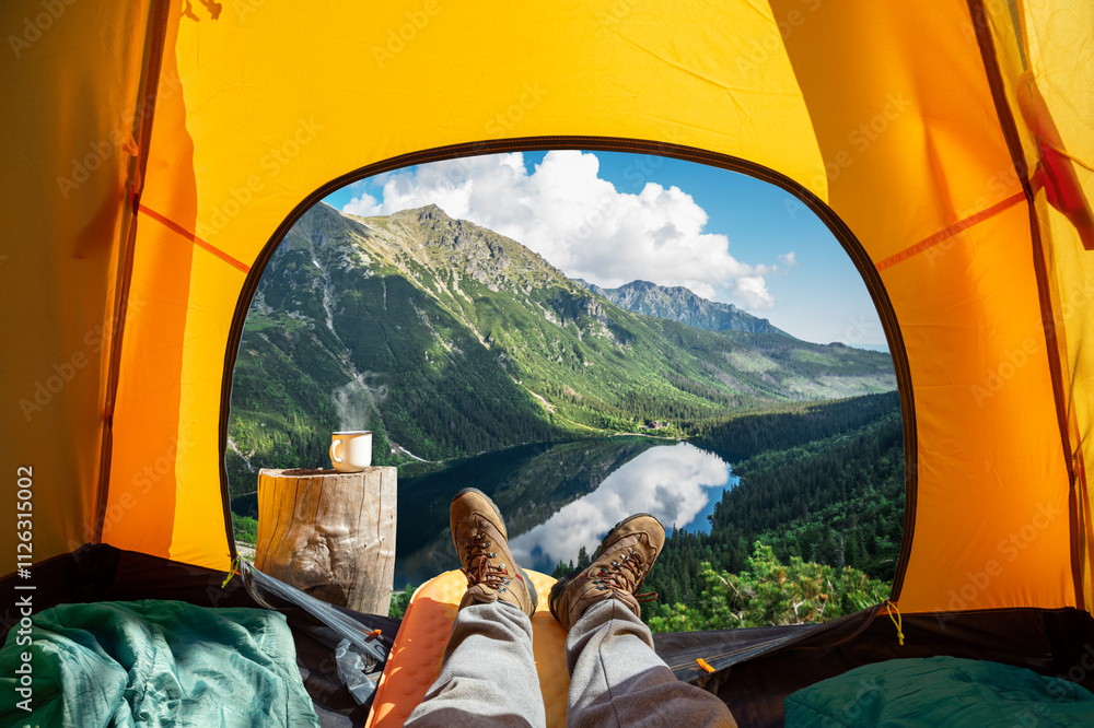 Spectacular view of nature from open tent entrance. The beauty of romantic trekking and camping.