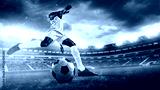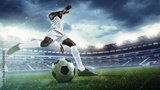 Low angle view of soccer player in white in motion on field, taking control of match. 3D render of open air arena. Dynamic evening match. Concept of sport, tournament, competition, game event