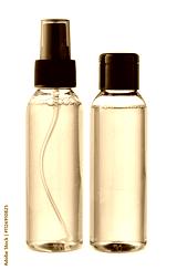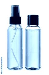 Various bottles with colored liquids and pumps arranged on white background