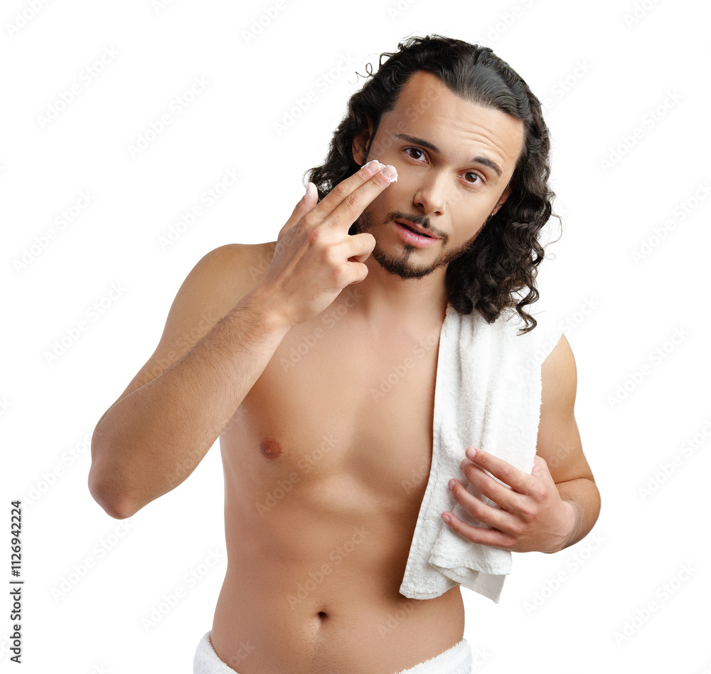 A young man applies skincare product on his face in a minimalist setting