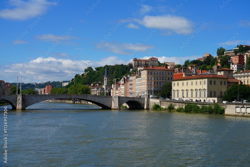 View of colorful buildings on the quay on the Saone River in downtown Lyon, France.