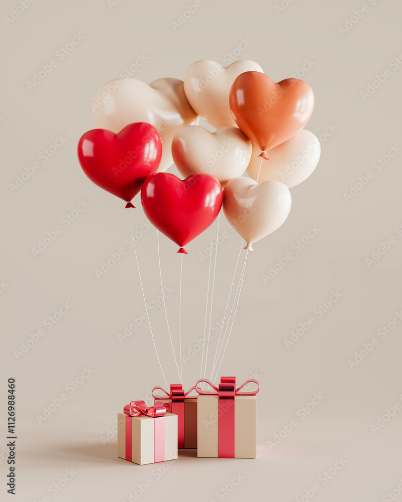 gift box with red hearts, balloons heart shape red and beige and gift boxes on beige color background, valentine concept, 3d rendering.