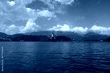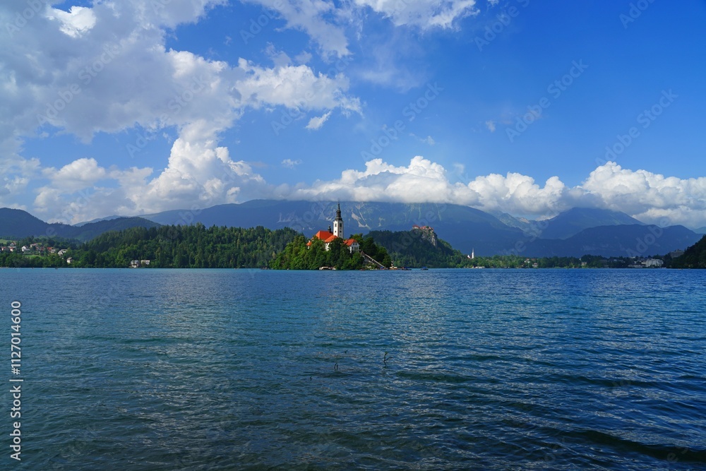 BLED, SLOVENIA -22 JUNE 2024- Landscape view of Lake Bled in summer. Bled is a lake in the Julian Alps of the Upper Carniolan region of northwestern Slovenia with a castle on an island.