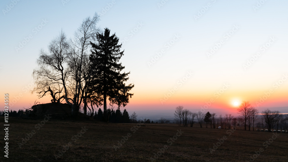 Colorful sunset in the Krkonoše foothills, Czech Republic.