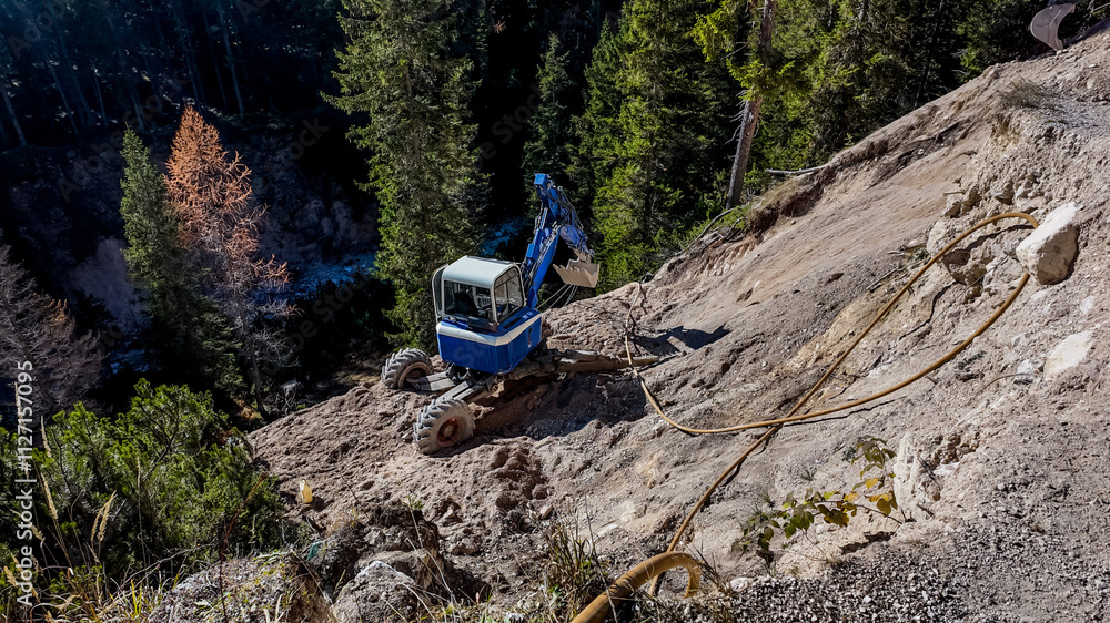 An excavator carefully navigates a steep, rocky terrain in a forest, illustrating challenges in construction and erosion control Dolomite Alps