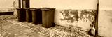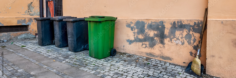 Four mismatched garbage bins and a broom line a weathered urban alley, highlighting the issues of waste management