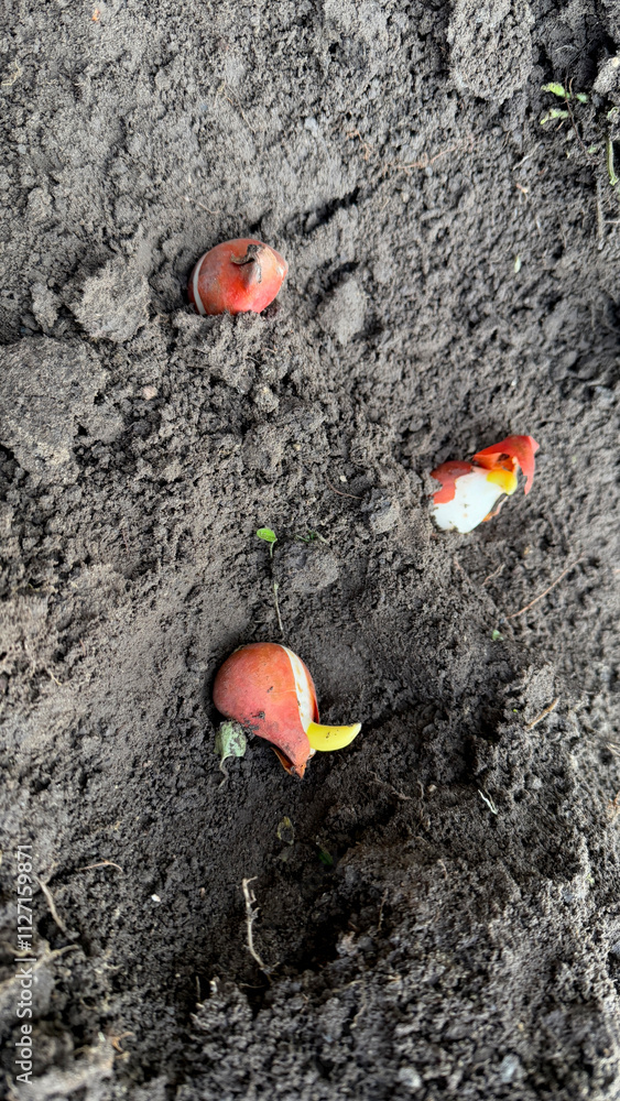 Sprouting tulip bulbs emerge from fertile soil, symbolizing growth and renewal in spring gardening