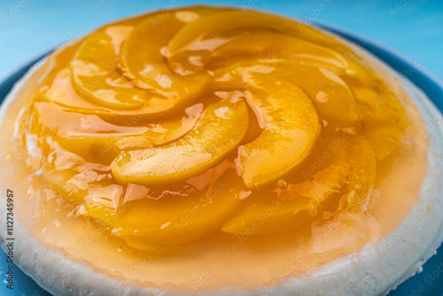 Peach, jelly dessert or cake. Homemade cheesecake with canned peaches on a blue plate