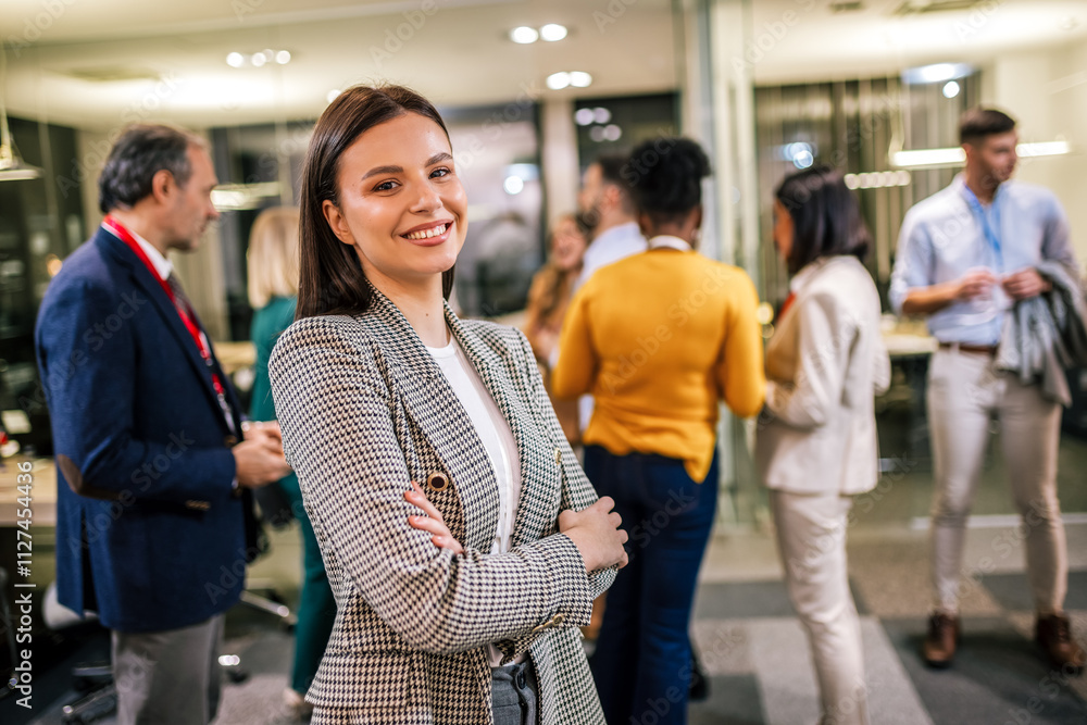 Business woman standing in her office in front of her colleagues with her hands crossed.