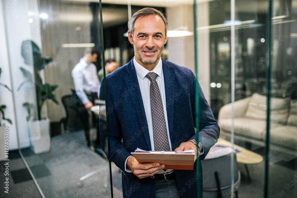 Older businessman standing in his office with paperwork.