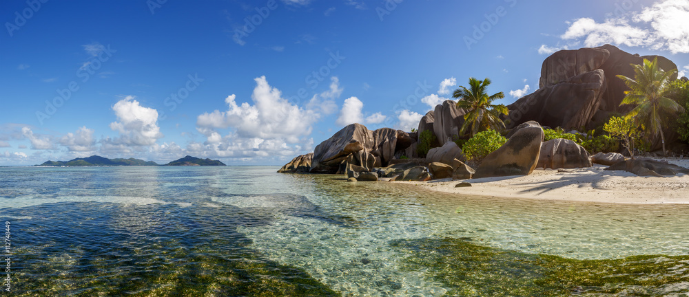 Seychelles, vue sur île de Praslin depuis l'île de la Digue