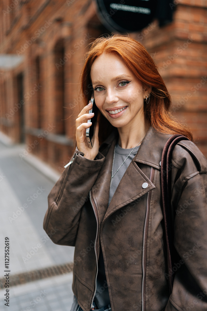Vertical portrait of charming young woman standing posing city street, enjoying pleasant conversation on smartphone, smiling looking at camera. Happy redhead female in stylish leather jacket in urban.