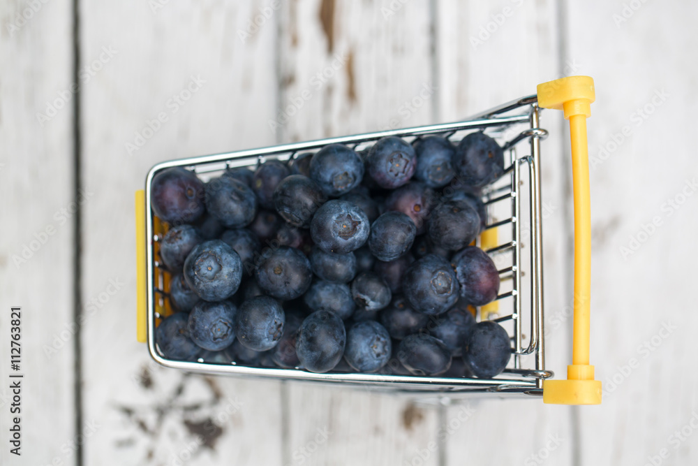 Miniatureinkaufswagen gefüllt mit Blaubeeren