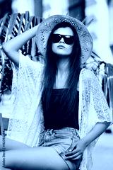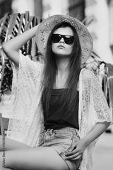 Portrait of young beautiful fashionable lady posing on street. Model wearing stylish summer clothes, straw hat & sunglasses. Girl looking at camera. Sunny day. Female fashion. City lifestyle. Toned