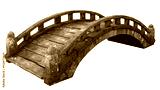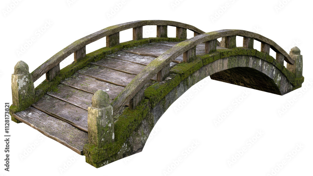 Rustic Wooden Bridge Covered in Green Moss, Curved Structure Over Calm Stream, Weathered Surface with Natural Elements Emphasizing Tranquility