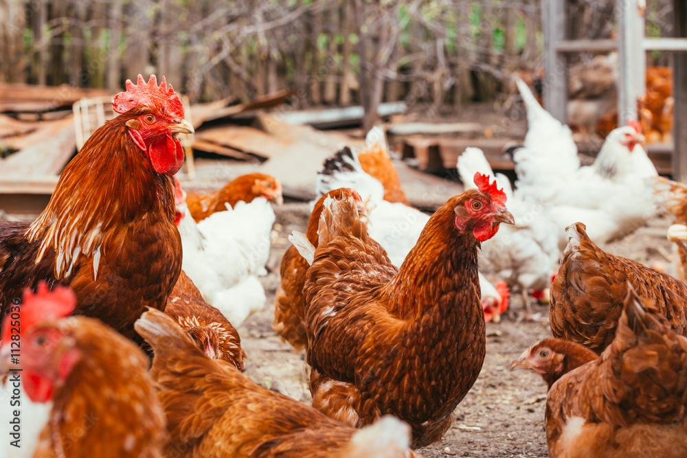 chicken and rooster walking around the yard