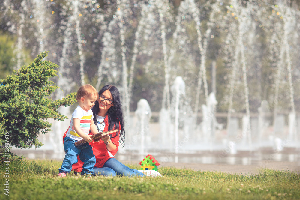 Beautiful mother and kid girl outdoors Happy mother showing her