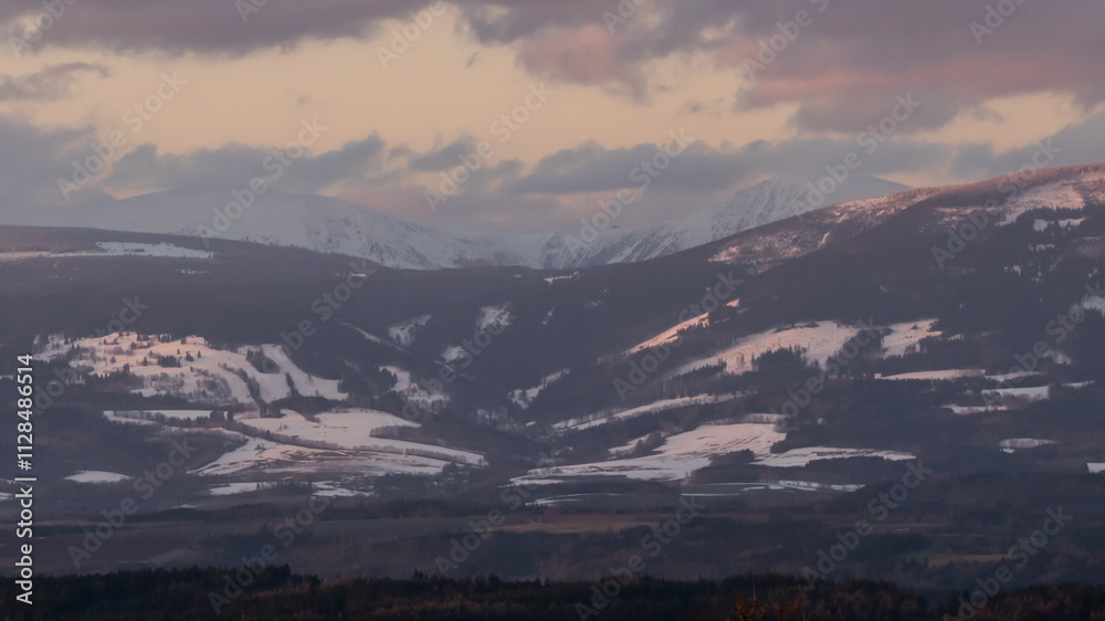 Colorful sunset in the Krkonoše foothills, Zvíčina, Czech Republic.