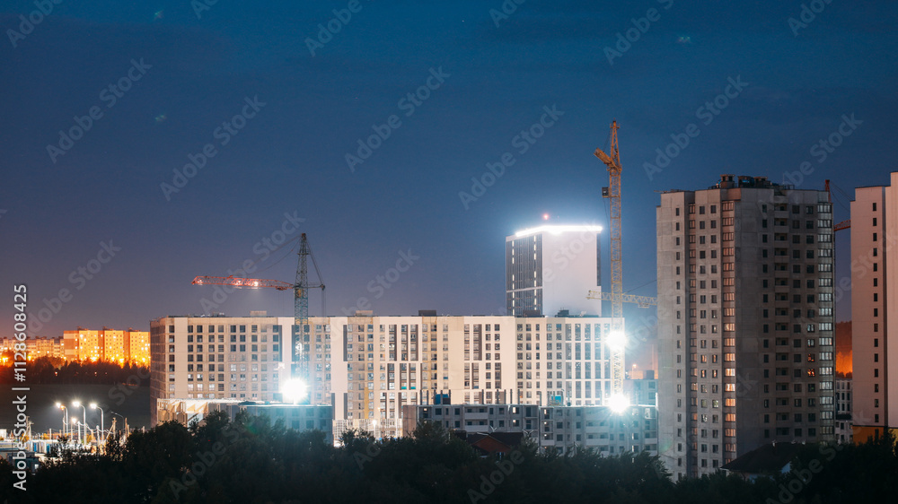 night works with construction site area. Development Multistorey Residential Building in night hours. development on construction site. night time work. Construction And Development Of Modern Multi