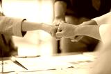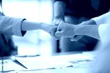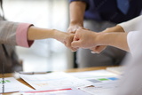 Coworkers gather around and hold hands in the workplace. Concept of cooperation with friends and teamwork.