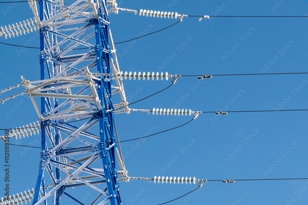 High-voltage wires and poles are covered with frost on a frosty winter day.