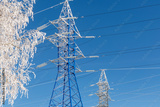 High-voltage wires and poles are covered with frost on a frosty winter day.