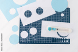white paper with circular cutouts, and a circle cutter tool. There is a blue cutting mat with a grid and various measurement markings, top view, Arts and crafts tool concept for design and print