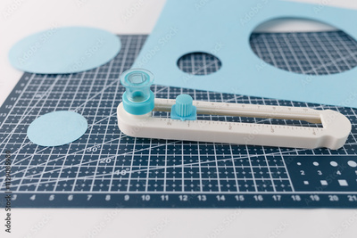 crafting tool and materials for cutting circles, including blue cutting mat with grid, blue paper with cutouts, circle cutter tool with sliding mechanism, white background, scattered cut-out circles