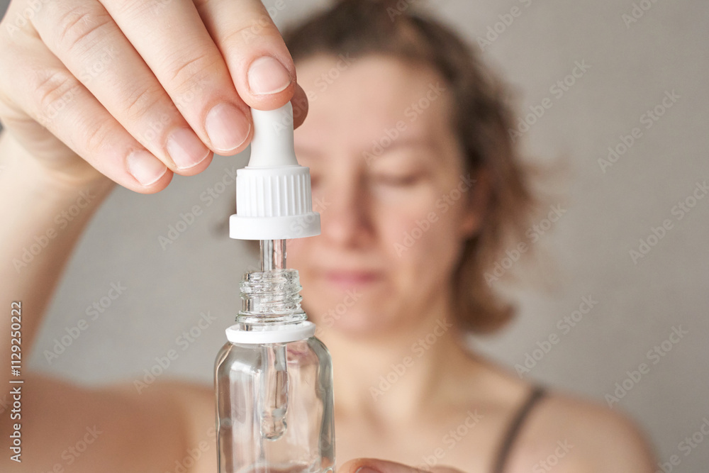 Caucasian female adult using skincare serum with dropper for facial routine at home.