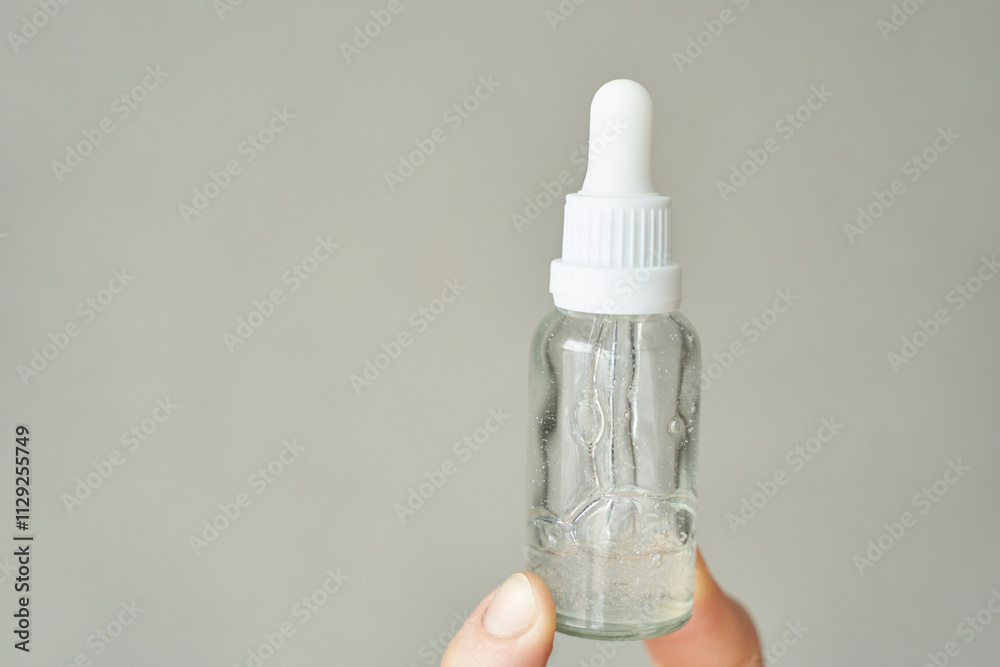 Clear dropper bottle with serum held by caucasian female hand against a neutral background.