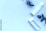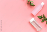 mycelial water, lotion for skin care and plant on pink background flat lay space for text