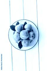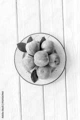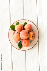 Summer fruits. Ripe red peaches on plate on white wooden table top-down copy space