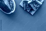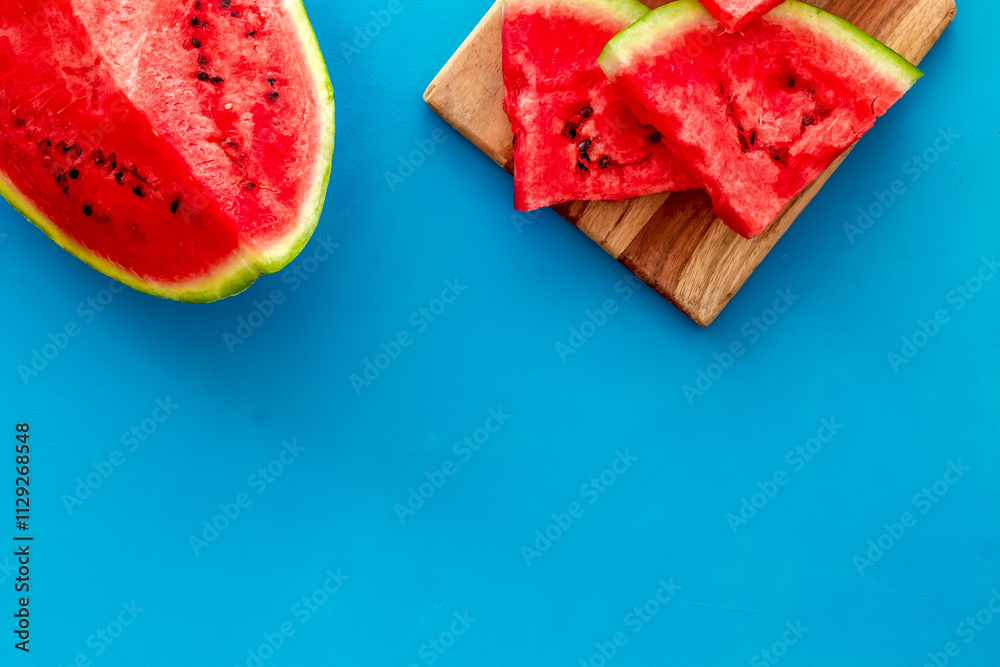 Fresh watermelon on blue background top view copyspace