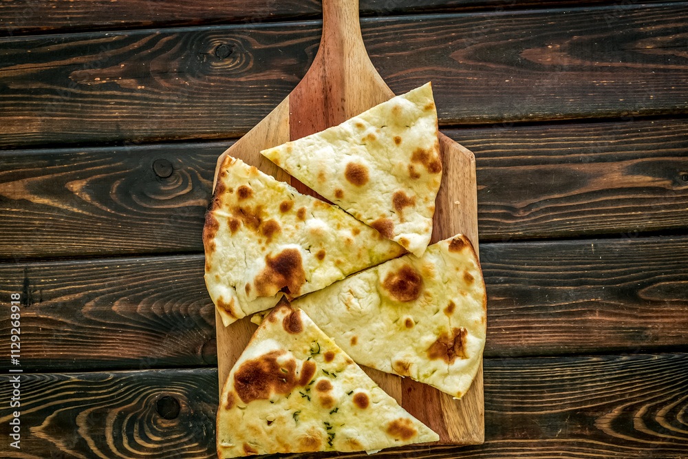 Make focaccia. Traditional italian bread on cutting board on dark wooden table top-down copy space