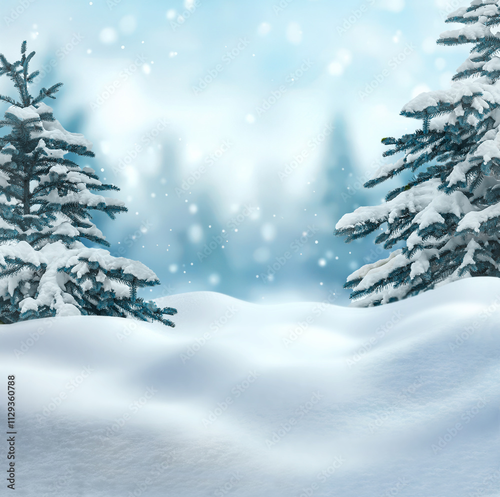 Christmas snowy landscape background with snow drifts hills and snow-covered fir trees