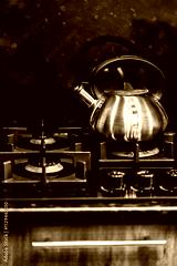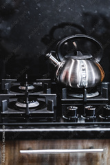 The kettle is on the gas stove.