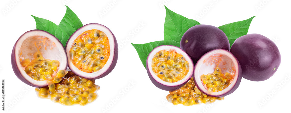 whole passion fruits half isolated on white background. maracuya with full depth of field