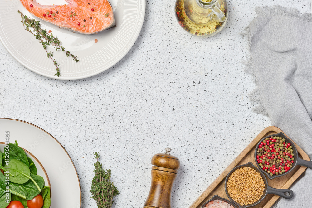 Raw piece of trout in white round plate and lemon slice, white background with spices. Top view