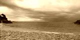 Sandy beach shore. Calm sea after rain. Seascape with dramatic sky.