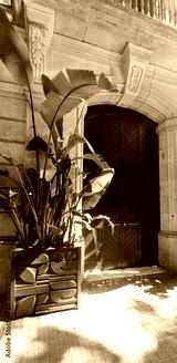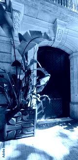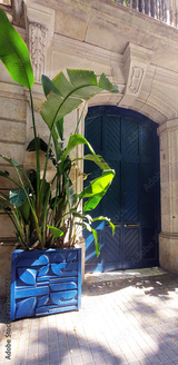 Beautiful blue door and blue planter with banana tree. Garden and exterior decoration.