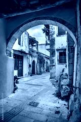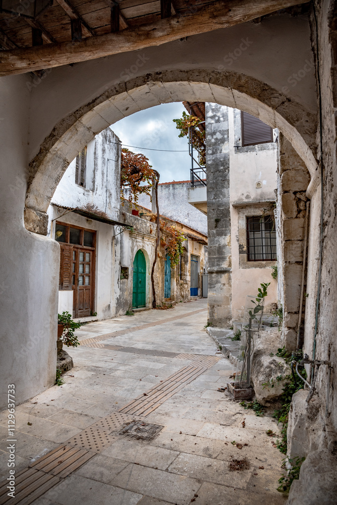 Old narrow street with stone arch at Agios Konstantinos, Rethimno, Crete, Greece.