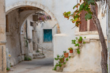 Old narrow street with stone arch at Agios Konstantinos, Rethimno, Crete, Greece.