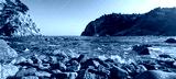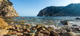 Wild beach with smooth stones. Shore, stones and sea illuminated by bright sun. Summer seascape.