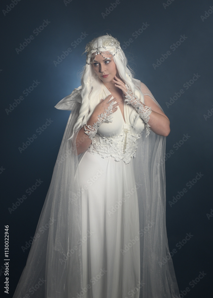 close up portrait of beautiful blonde female model wearing white fantasy snow fairy gown, magical silver crystal queen crown, hooded flowing cloak. Isolated pose on dark studio background.